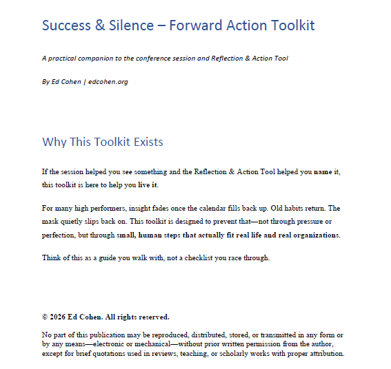 This toolkit supports individuals in integrating insight into daily life, leaders in shaping how they show up for others, and organizations in turning awareness into culture. It offers practical, grounded steps to embed presence, trust, and psychological safety into everyday work—so honesty becomes sustainable and strength is redefined in real, lived ways.
